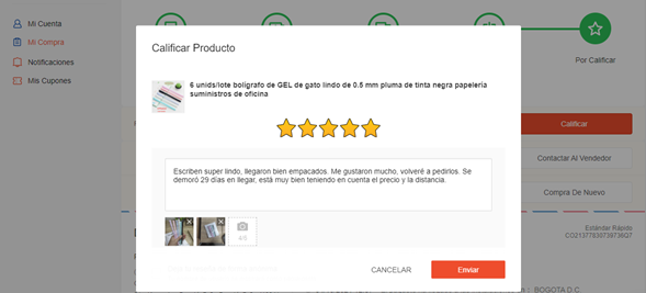 Ahora bien, una vez me llegó el pedido, lo califiqué, esto es importante ya que ayudas a otros usuarios de la plataforma a tener una idea clara del proceso, de los tiempos y la calidad del producto.
