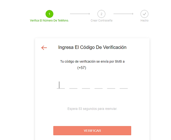 Luego de ingresar el número de tu móvil, se generó un rompecabezas que debí ajustar deslizando la flecha color naranja cuidadosamente hasta el lugar que corresponde, esto es como un CAPTCHA, el objetivo de validar que no era un robot quien intentaba realizar la creación de la cuenta. Una vez superé el rompecabezas, coloqué el código de validación que me llegó al móvil mediante un mensaje de texto para culminar el proceso de registro.