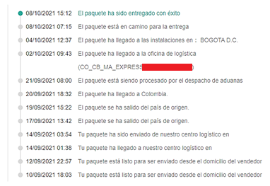 - 02/10/2021 09:43 El paquete ha llegado a la oficina de logística (CO_CB_MA_EXPRESS:ML1234567890MH)